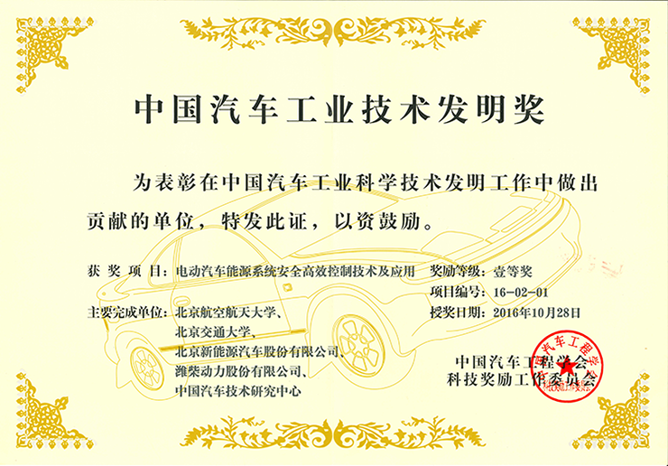 中国汽车工业技术发明奖一等奖(电动汽车能源系统安全高效控制技术及应用)