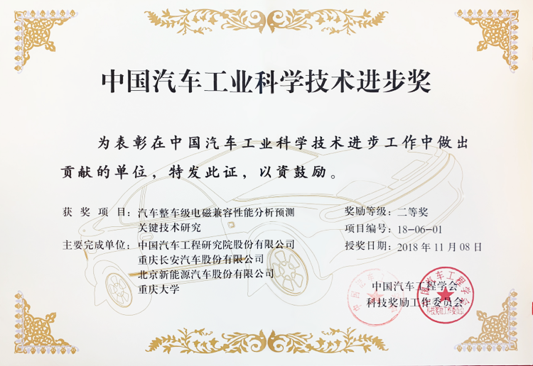 中国汽车工业科学技术进步奖二等奖(汽车整车级电磁兼容性分析预测关键技术研究)