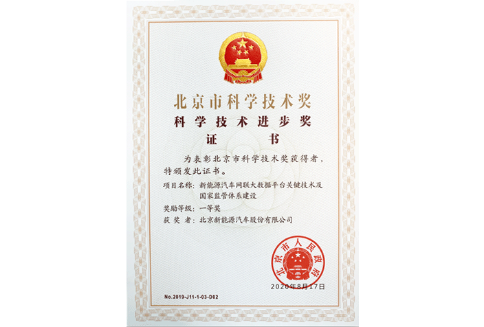 北京市科学进步一等奖(新能源汽车网联大数据平台关键技术及国家监管体系建设)