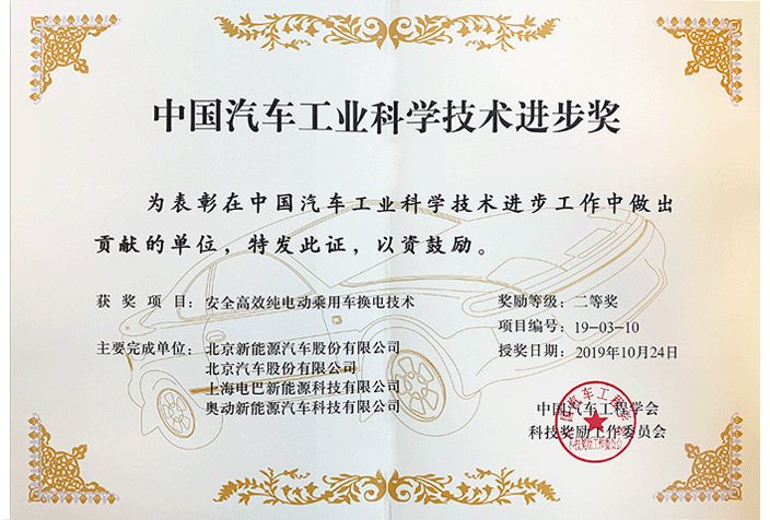 中国汽车工业科学技术进步奖二等奖(安全高效纯电动乘用车换电技术)
